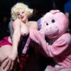 Arriving at the club that night, I found that the aesthetic was more Vietnam prison than the 1940’s USO experience I expected. None the less, I breezed easily past the door man offering a friendly hello. The bartender was bare-chested in leather short shorts and had rat traps dangling from his nipples. He looked pretty frightening to me, but when he saw me, he sprang to life practically lifting right out of his Doc Martens with excitement. “Helllllllloooooooo Miss Martini!! Oh, we’ve been so looking forward to seeing your show!” The dressing area was in the basement filled with giant industrial cans of tomato soup and mannequin parts, crepe paper and saw horses. I gamely put on my pointe shoes as a few friends helped me blow up my balloons. One was my favorite drag performer, Girlina, who happened to be dating my roommate at the time so they came to support me with a few random friends of ours. I was star struck as they fluttered around me primping, tying off red balloons and offering advice. When I hit the stage, there was a strange silence. The lights were bright in a very dark room and I could barely see the audience. I heard murmurs over my music as I danced and posed. Then, so clearly I heard “she’s on pointe” from the back of the room and the crowd exploded in screaming and applause.
